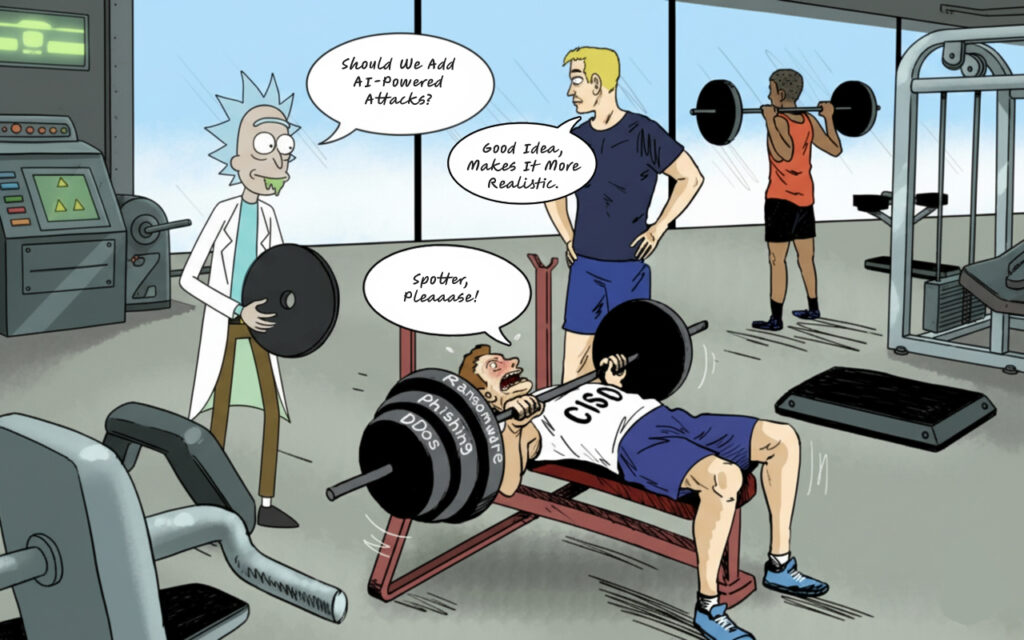 A CISO strains beneath a loaded barbell, the plates etched with Ransomware, Phishing, DDoS, and Zero-Days. Around them, vendors debate not how to help lift the weight, but which new one to add next. One waves a fresh plate labeled AI-powered attacks.